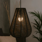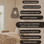 Lustre pendente em formato de gota com acabamento em corda náutica, indicado para iluminação decorativa de ambientes internos. Possui estrutura em ferro, produção artesanal e acompanha kit completo para instalação, ideal para salas, quartos e áreas sociais.